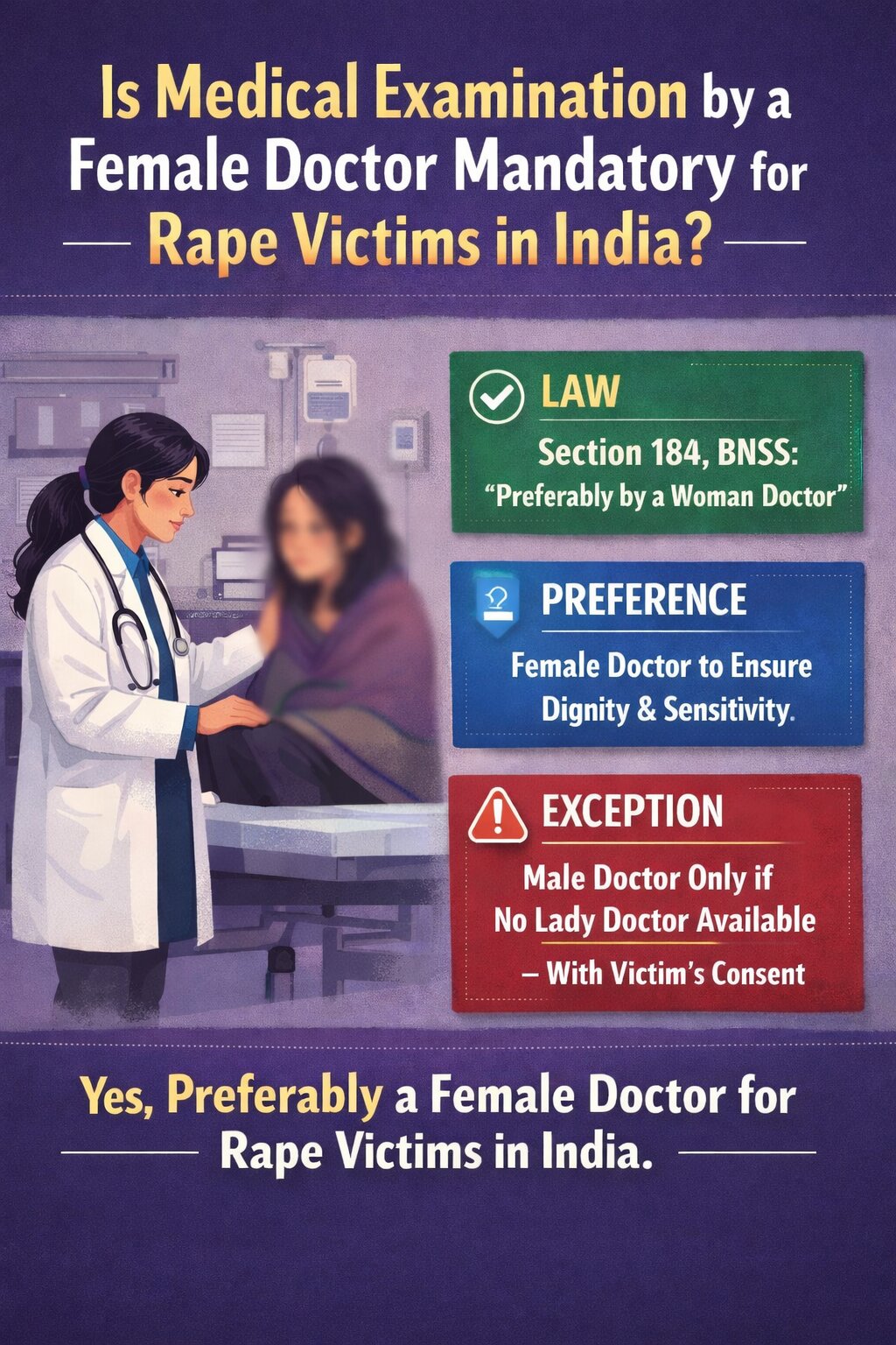 The Indian legal system operates on a dual-track: strict statutory protection for children and a “preference-based” model for adults. While the BNSS provides the procedural backbone, judicial overtones increasingly lean toward a total “female-only” examination model for all women to prevent secondary victimization. The shift from the CrPC to the BNSS maintains the “no-delay” principle, ensuring that the search for a female doctor does not compromise the collection of time-sensitive forensic evidence.