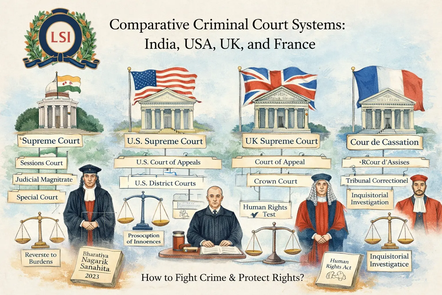 The organisation of criminal courts forms the backbone of a nation’s justice delivery system. The structure, jurisdiction, and procedural framework determine how swiftly and fairly criminal cases are adjudicated. While the substantive criminal law prescribes offences and penalties, it is the criminal court hierarchy that ensures due process and the rule of law. Different jurisdictions organise their criminal courts in line with their constitutional structures, legal traditions, and socio-political contexts. This article compares the court systems of India, the United States, the United Kingdom, and France, with emphasis on jurisdictional distribution and relevant case law.