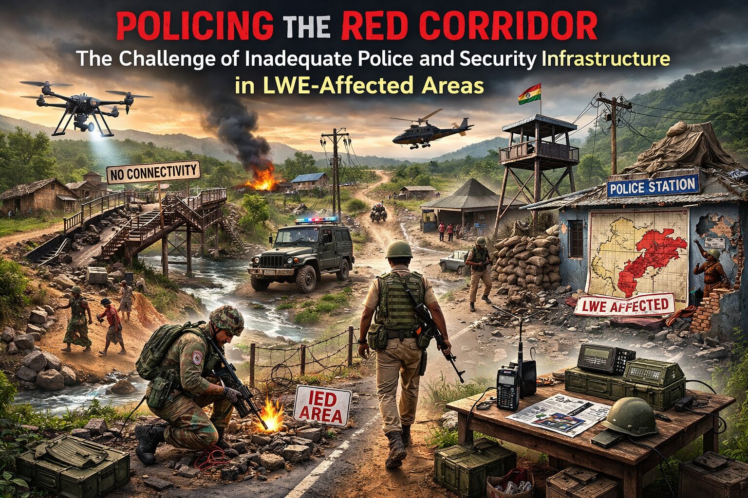LWE-affected areas—often referred to as the “Red Corridor”—span remote, forested, and underdeveloped districts across multiple states. These regions are characterised by difficult terrain, sparse population density, poor connectivity, and deep socio-economic deprivation. In such an environment, the absence or inadequacy of police infrastructure significantly constrains the state’s ability to establish effective control and protect civilians.