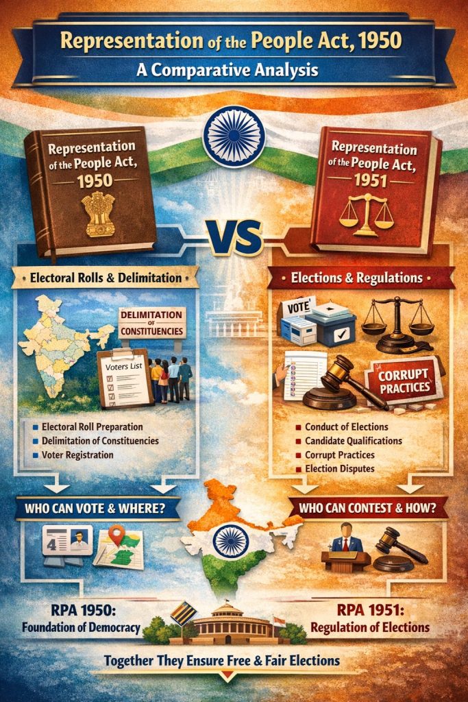Free and fair elections are the cornerstone of a democratic polity. In India, the constitutional vision of representative democracy under Articles 324 to 329 is operationalised primarily through two key legislations: the Representation of the People Act, 1950 and the Representation of the People Act, 1951. Though often mentioned together, the two Acts serve distinct yet complementary purposes within the electoral framework. While the Act of 1950 lays the foundation of electoral democracy, the Act of 1951 regulates its actual functioning and integrity.