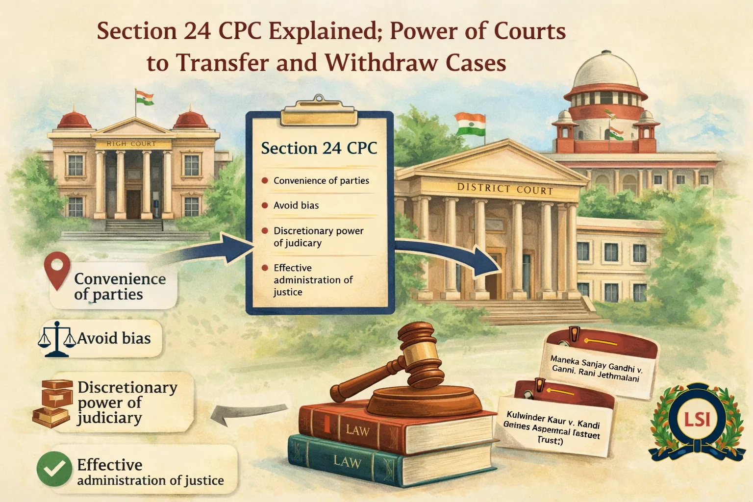 Section 24 of the Code of Civil Procedure, 1908 plays a significant role in ensuring a fair and proper administration of justice. This provision also safeguards the rights of litigants and prevents hardship, bias, and conflicting judgments by empowering the High Court and District Court to transfer or withdraw cases. Judicial interpretation has made it clear that this power is discretionary and must be exercised judiciously and only when the interests of justice demand. When applied judiciously, Section 24 CPC strengthens public confidence in the judicial process and ensures that justice is not only done but is also seen to be done.