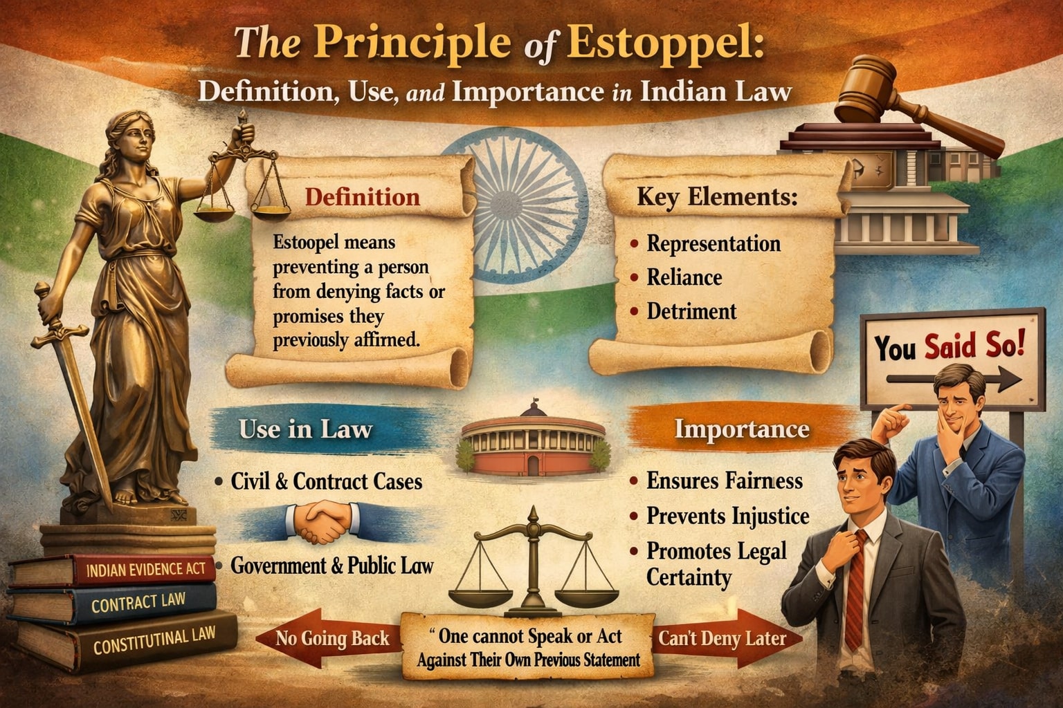 Estoppel is a legal rule that ensures fairness by stopping someone from denying a fact or making a claim that conflicts with their prior statements, actions, or promises—especially when someone else has relied on those to their disadvantage. In India, this principle guides courts to maintain honesty and prevent unfairness in legal matters, whether in business, government dealings, or personal disputes.
