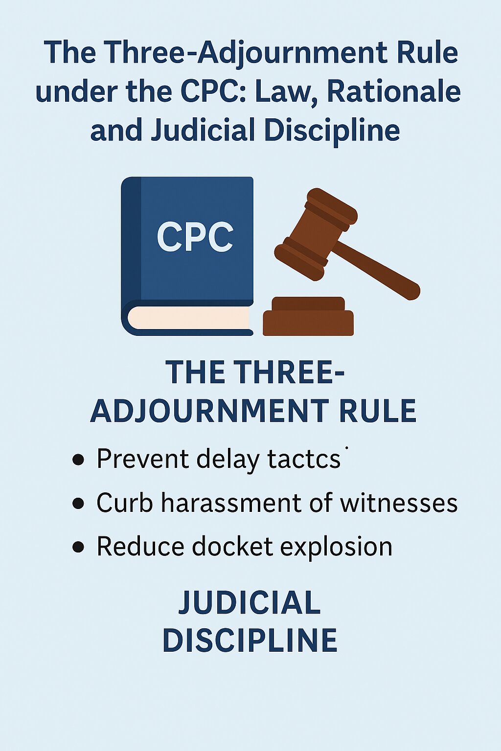 The Three-Adjournment Rule under Order XVII Rule 1 of the Code of Civil Procedure, 1908 (CPC) was introduced to address the chronic delays that plagued civil litigation in India. Originally, the CPC did not impose any numerical restriction on adjournments, leaving courts with wide discretion that was often misused, leading to repeated postponements and mounting arrears.