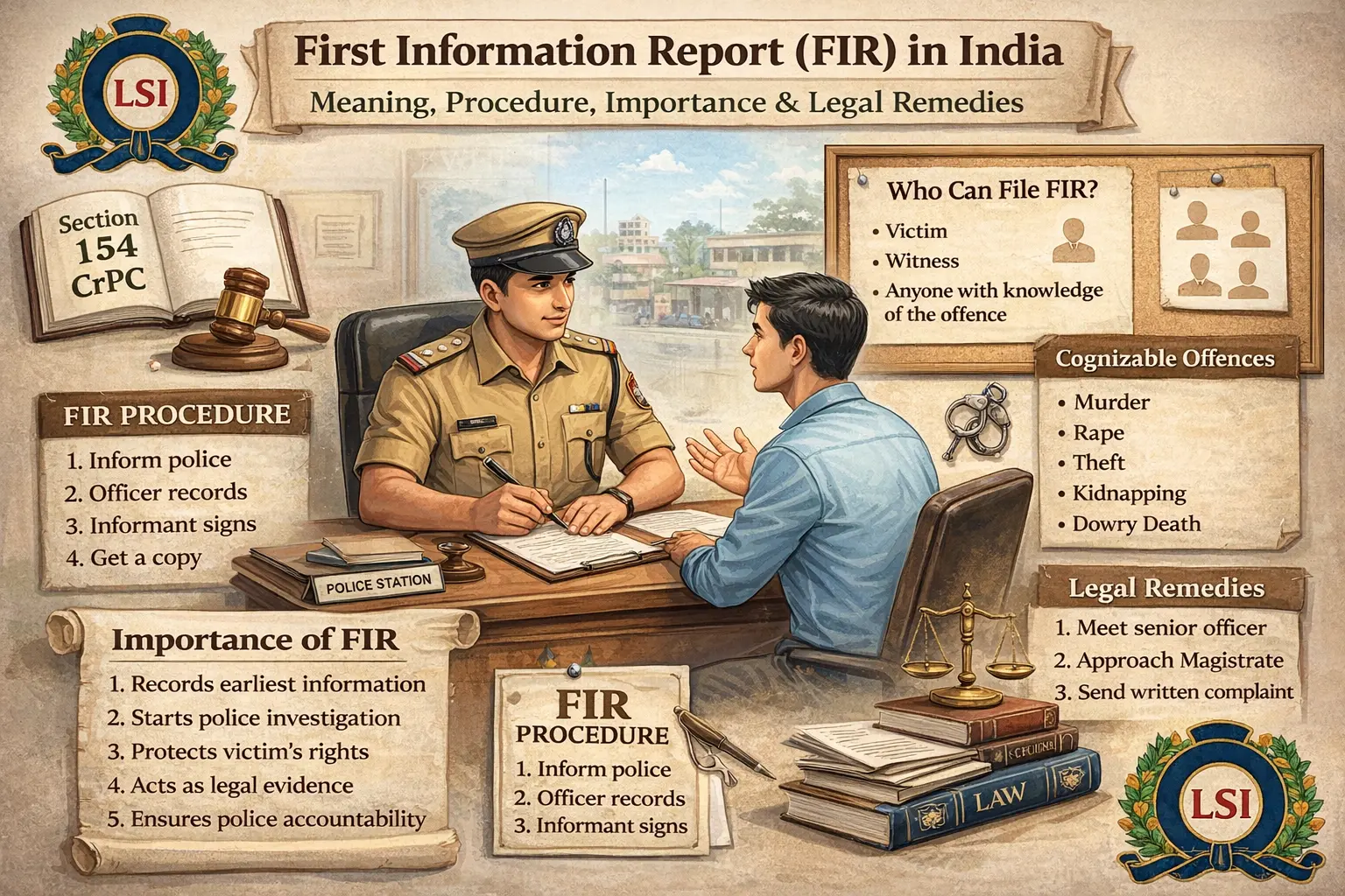The First Information Report is a crucial element of the criminal justice system in India. It not only initiates the process of investigation but also safeguards the interests of both the victim and the accused. Section 154 of the CrPC makes it mandatory for the police to register an FIR in cognizable offences, thereby ensuring access to justice. Hence, an FIR serves as the foundation of criminal proceedings and plays a vital role in maintaining law and order in society.