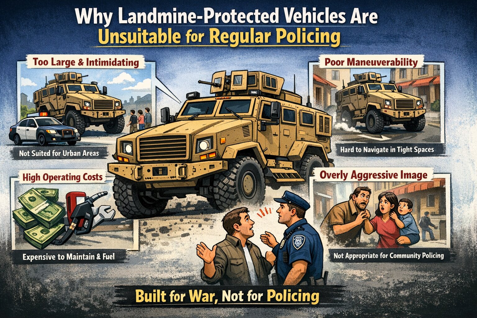 However, a growing tendency to deploy such vehicles for routine policing tasks—law and order duties, crime prevention patrols, election security, or crowd control—has raised serious operational, psychological, and governance concerns. What is effective in a battlefield-like environment may be counterproductive, even damaging, in civilian policing contexts.